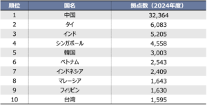アジア地域の国ごとの拠点数を見てみると、日本企業の進出はごく一部の国に集中していることが分かる。なかでも中国は32,364拠点とアジア全体の中で中心的な存在となっている。これに続いて、タイ、インド、シンガポール、韓国、ベトナム、インドネシア、マレーシア、フィリピン、台湾が並ぶ。拠点数で見ると、これら上位10カ国だけでアジア全体の拠点数のおよそ97%を占めており、日本企業の進出先がかなり限られた国に集まっていることが分かる。