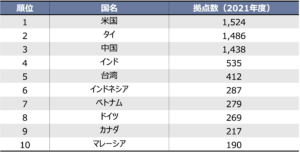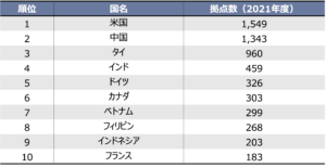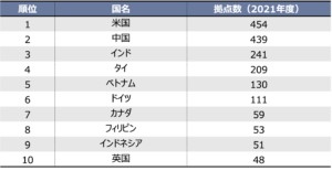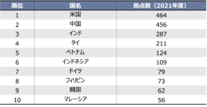 - 近年ではアジアの新興国(インド・ベトナム・インドネシア)の拠点数が増えており、アジアにおける進出先の分散が進んでいること