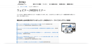 ジェトロが国内外から配信しているセミナーをオンラインで視聴できるサービスである。最新の政策の動きや市場のトレンド、各国の制度の解説、企業の事例など、さまざまなテーマが随時提供されている。ライブ配信に加え、一部の内容は録画されたアーカイブとして無料で公開されているため、自分に必要なタイミングで効率よく情報をインプットできる点も便利である。