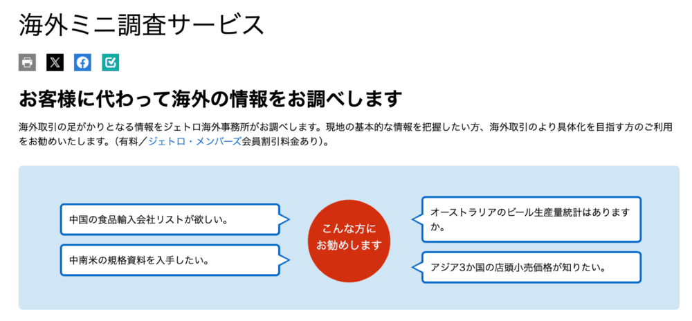 海外事務所が、企業リストや現地の法令、統計データ、店頭価格などの基礎情報を代わりに調べる有料サービスである。海外出張や本格的な調査を行う前に、最低限の実務情報を短い期間で手に入れたい企業に適している。中小企業には割引があり、調査内容に応じて柔軟に依頼できる点も使いやすい。