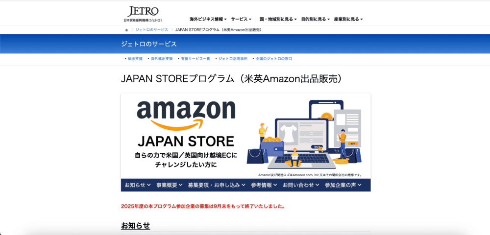 JAPAN STOREプログラムは、米国・英国のAmazon上にある特設ページで日本商品をまとめてPRし、出品の手続きから販売促進までをAmazonとジェトロが一緒に支援する取り組みである。越境ECに自社で挑戦したい企業向けで、出品支援や売上改善のアドバイス、現地向けのマーケティングが提供される。Amazon販売の立ち上げでつまずきやすい点を専門家が補い、海外の一般消費者への露出を大きく高められるプログラムである。