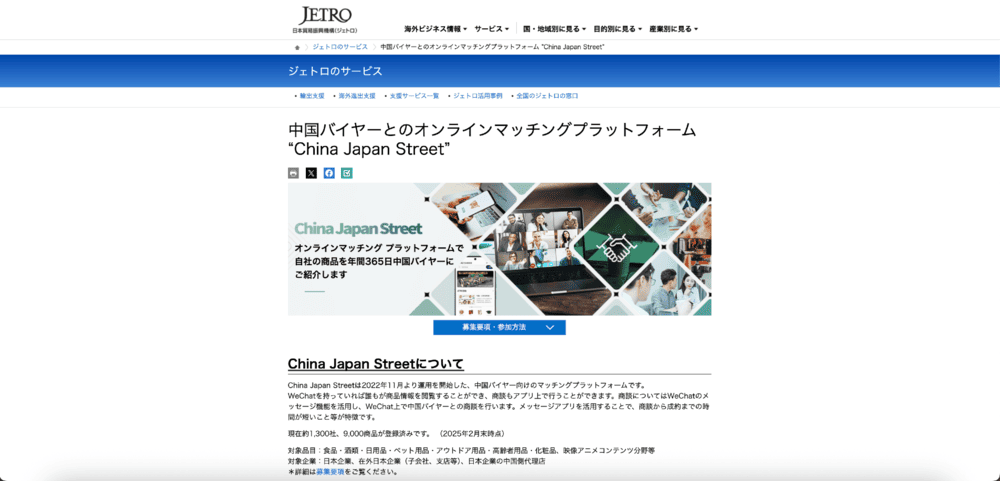 China Japan Streetは、WeChat上で商品検索から商談までを完結できる、中国向けのマッチングサービスである。スピード感のある商談につながりやすい点が特徴で、中国全土のさまざまなバイヤーに向けて、365日商品を届けることができる。現地への出張をせずに販路開拓を進めたい企業に適している。