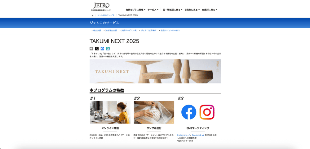 TAKUMI NEXT 2025は、日本の技や生活文化を生かした商品を扱う企業を対象に、海外バイヤーとのオンライン商談やSNSでの発信を通じて、輸出の拡大を支援するプログラムである。Japan Streetに登録している企業の中から選ばれた企業に対し、サンプルの送付支援や、海外5地域・約20社のバイヤーとの商談の機会が提供される。