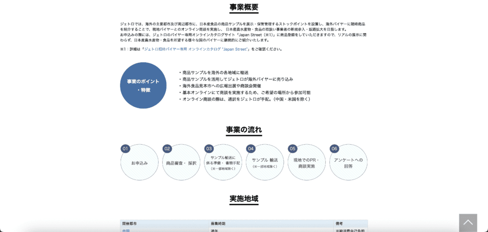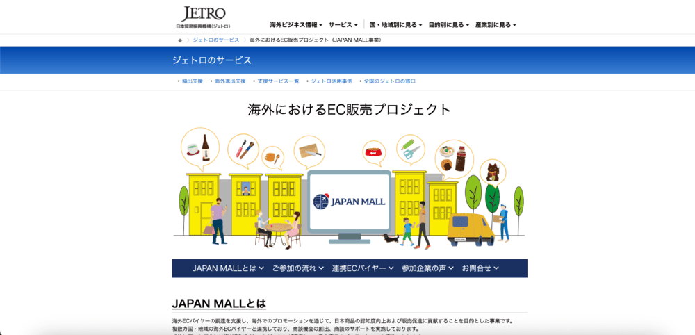 輸出がはじめての企業でも参加しやすく、成約後は現地ECでの販売促進までジェトロが伴走する。食品・雑貨・化粧品などの消費財について、海外EC販売を試してみたい企業に向いた無料プログラムである。