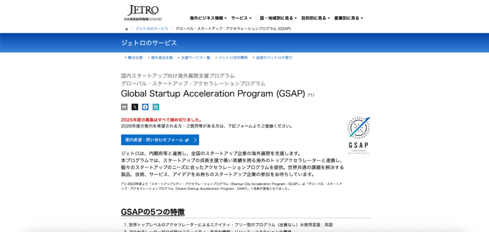 GSAPは、世界トップアクセラレーターと連携し、日本のスタートアップの海外展開を無償で支援するプログラム。分野別5コースで、英語メンタリングや現地渡航を通じ、市場参入や投資家との接点づくりを後押ししする。