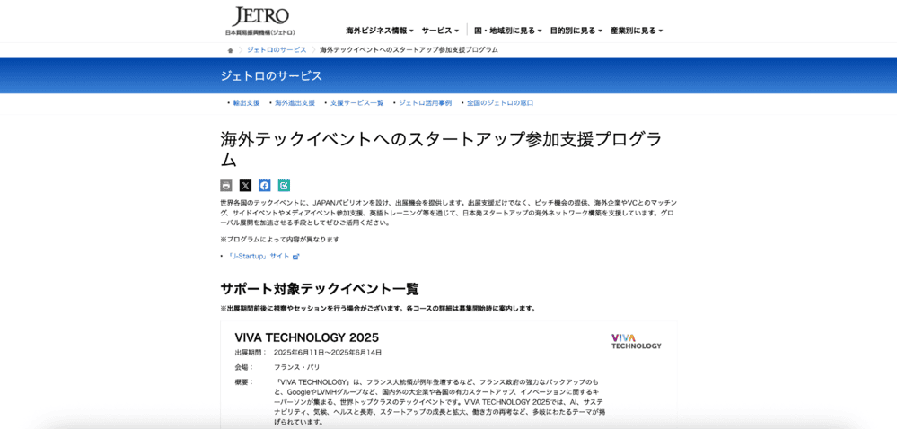 JETROは世界主要テックイベントにJAPANパビリオンを設け、出展やピッチ、海外VCとのマッチング機会をスタートアップへ提供する。英語トレーニングやサイドイベント参加支援も含め、国際的な露出拡大と海外ネットワーク構築を強力に後押しする。
