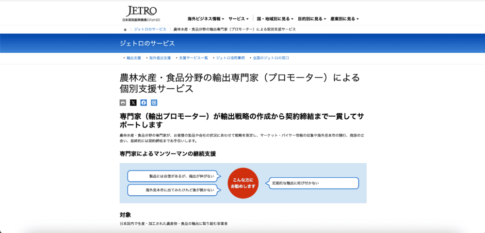 農林水産・食品分野にくわしい輸出の専門家が、戦略づくりから商談への同行、契約の締結までを一貫して支援するサービスである。商品には自信があるものの輸出が伸びない企業や、見本市のあとに商談が続かない企業に適している。国内の事務所と専門家が連携し、バイヤー探しや実務の支援をマンツーマンで行っている。