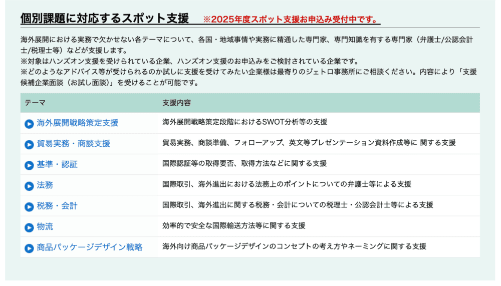 前に紹介した「新輸出大国コンソーシアム」によるハンズオン支援は、継続して伴走する支援である。一方で、特定の課題だけを解決したい企業に向けて、専門家がテーマごとに対応するスポット型の支援も用意されている。海外展開の初期の検討から、ピンポイントの課題解決まで、必要な範囲だけを柔軟に活用できる点が特徴である。